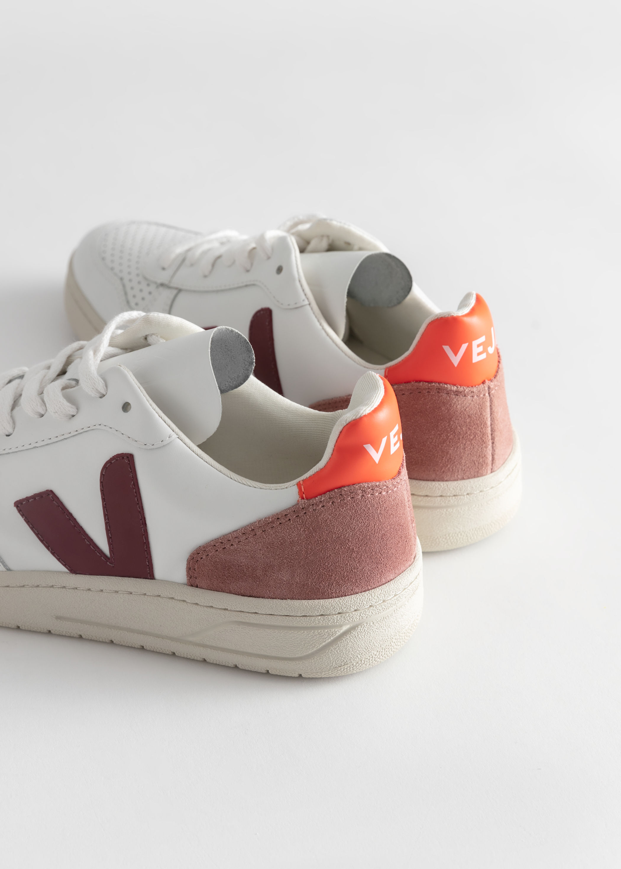 Add to Wish. Veja Womens V-10 Leather Shoes. Made from a blend of consciously sourced sustainable materials these Veja Womens V-10 Leather Shoes have been decorated with dried petal coloured suede heel sections and marsala coloured rubber V overlays upon crisp extra.